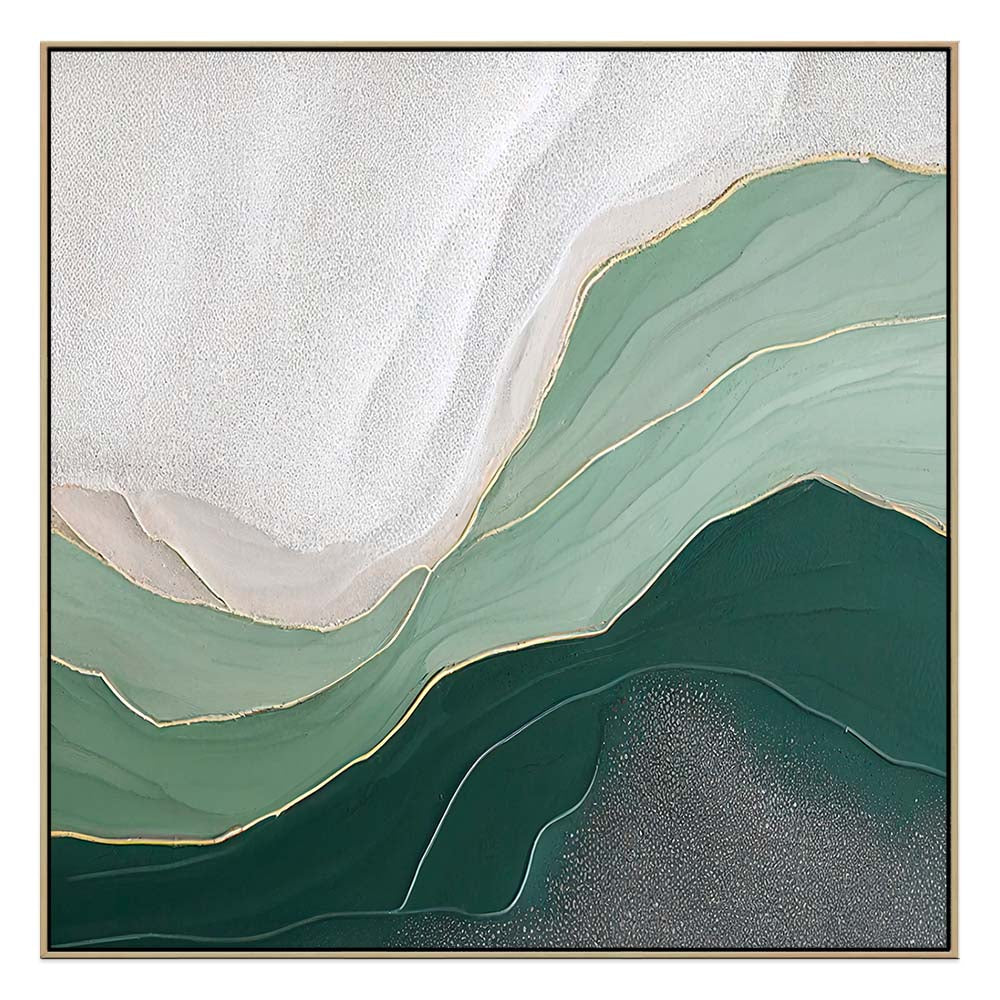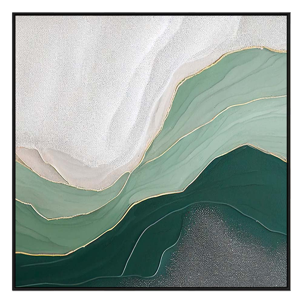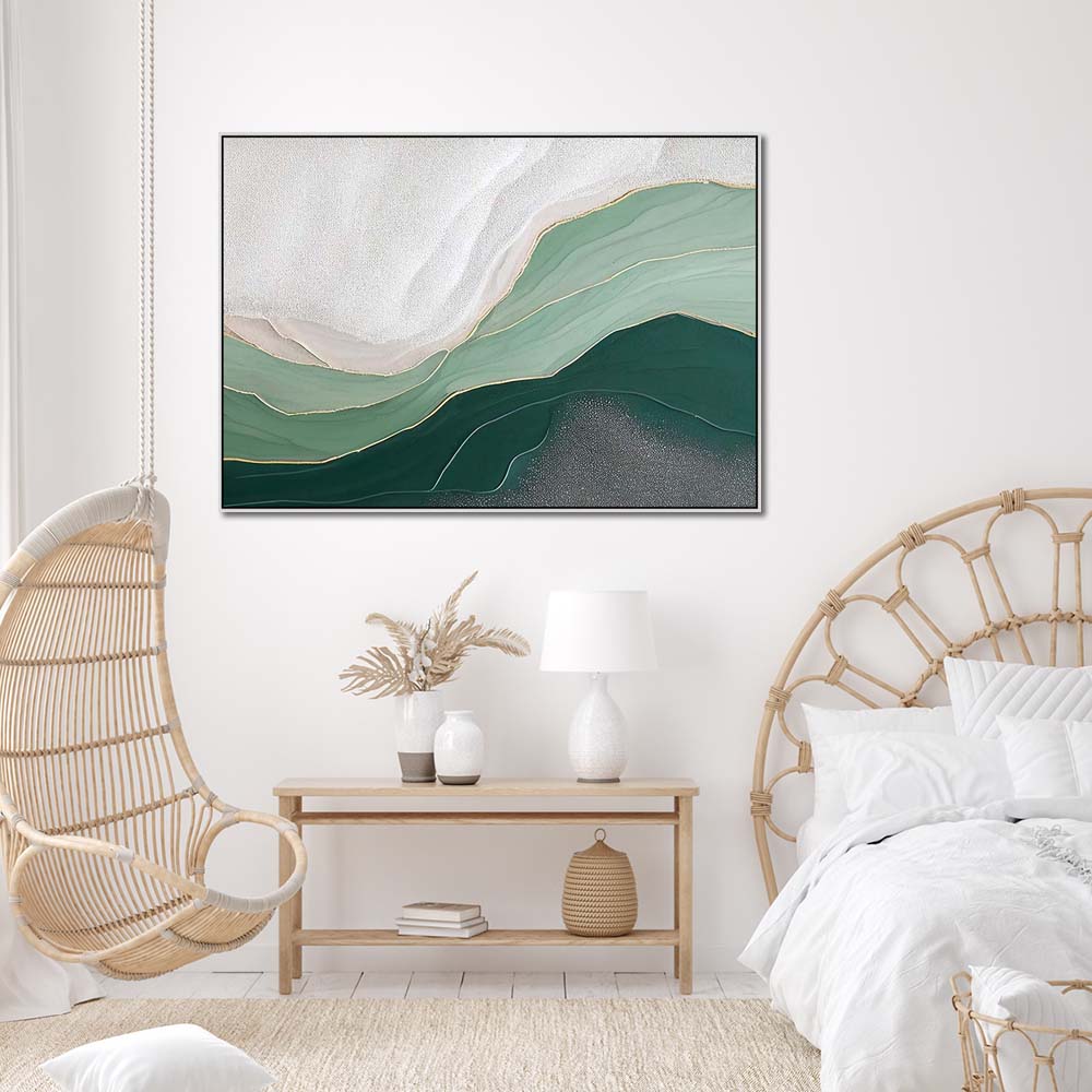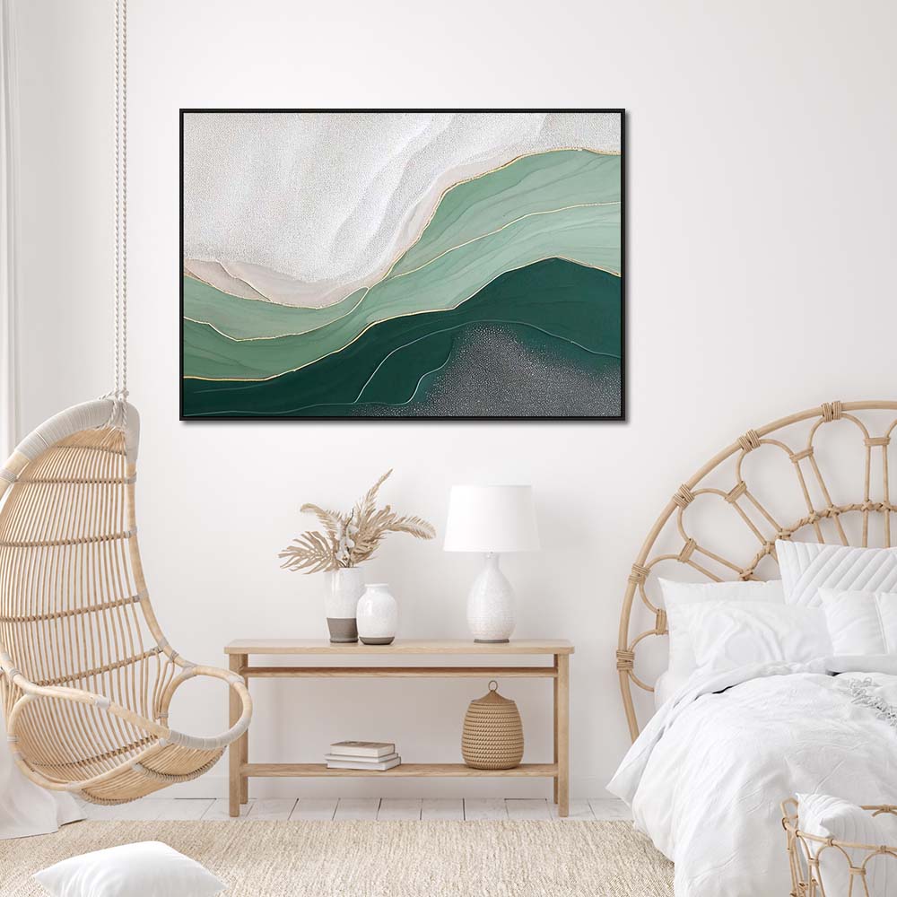 This modern abstract artwork blends soothing green, soft grey, and crisp white tones to create a sense of balance and calm. Perfect for contemporary interiors, it adds a fresh, natural elegance that complements both minimalist and coastal spaces.