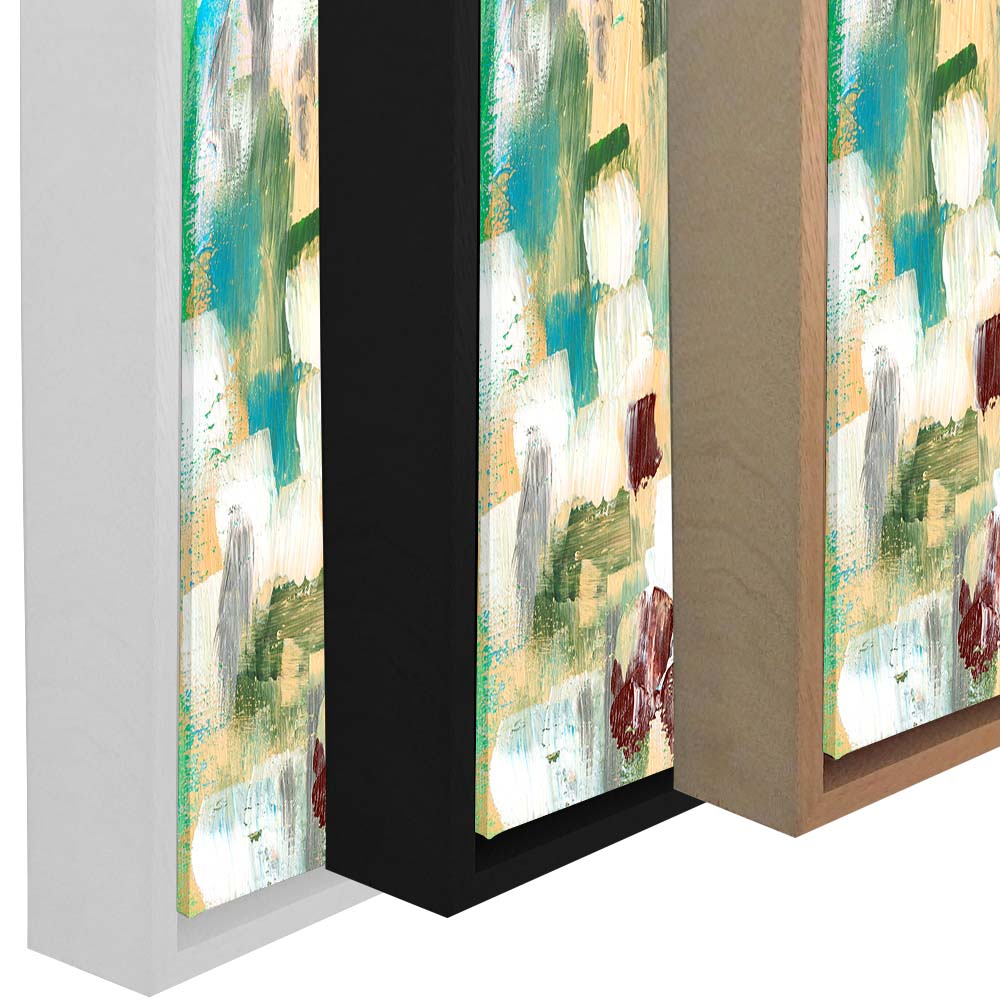 Our canvas prints are fitted with an outer floating frame in a choice of natural oak, satin black or satin white finish that is made from timber composite materials and features a 45mm deep profile.
