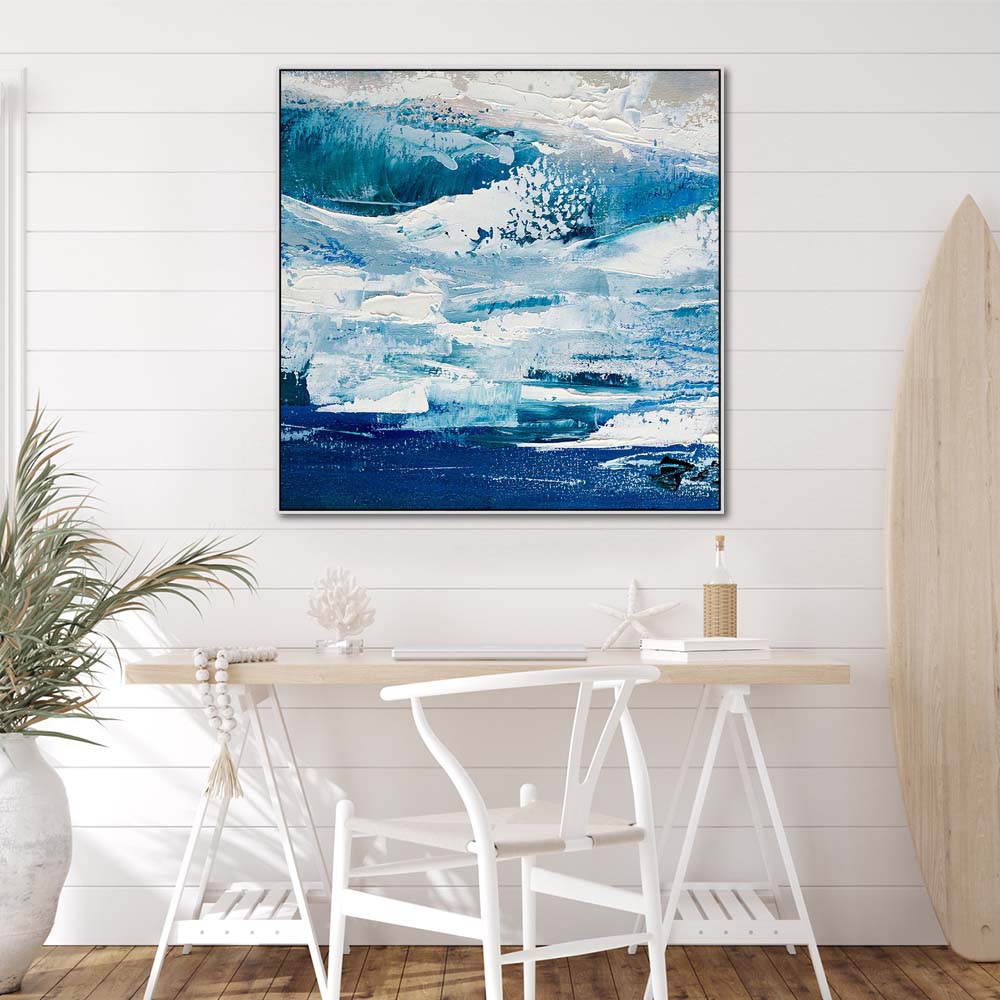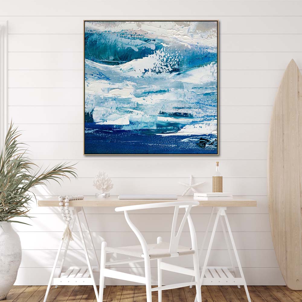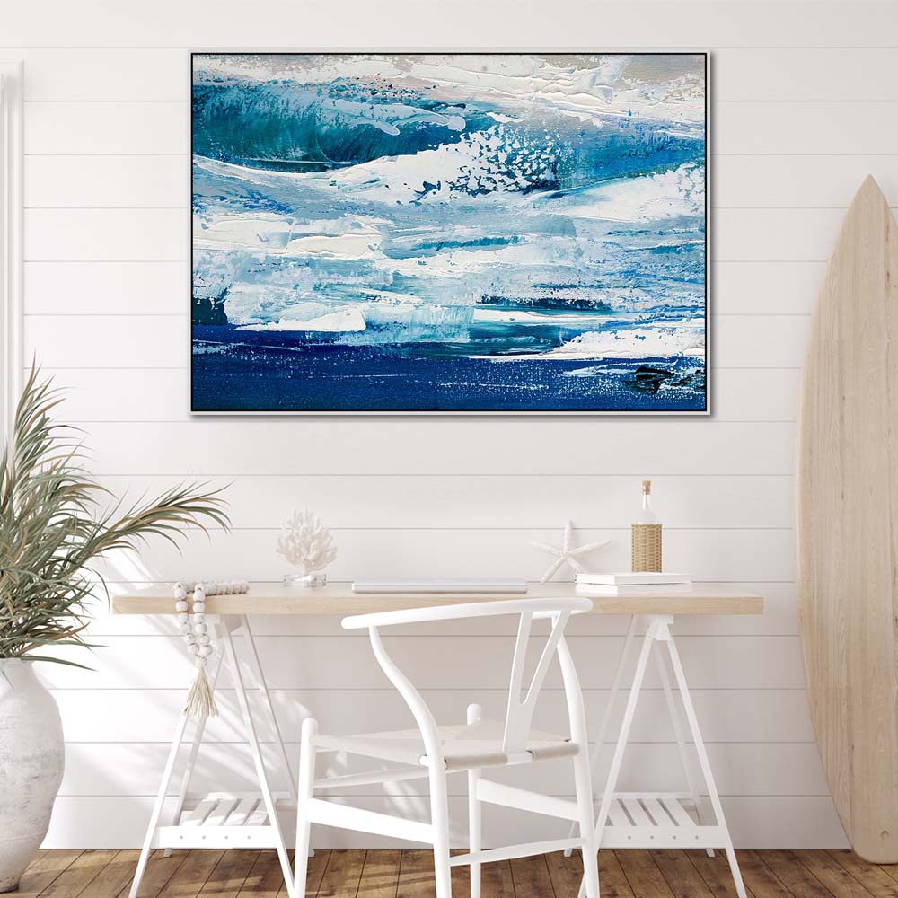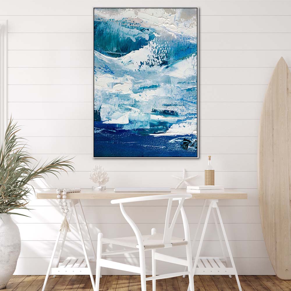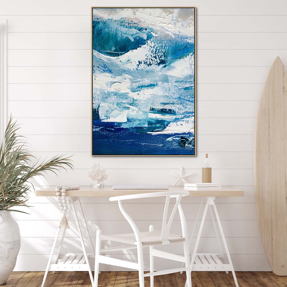 This coastal-inspired abstract artwork blends blue and white tones with soft, natural textures, evoking the calm rhythm of the ocean. Elegant and timeless, it brings a refined coastal sophistication to any modern interior.