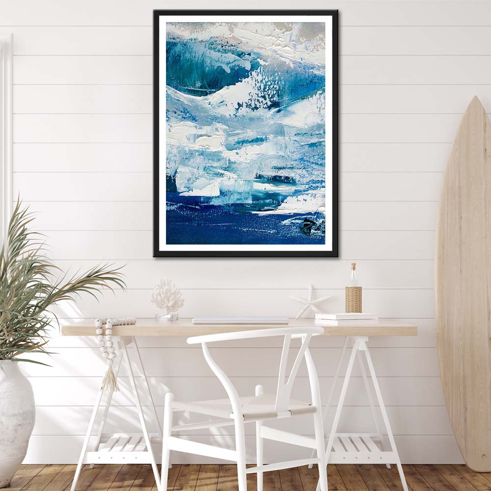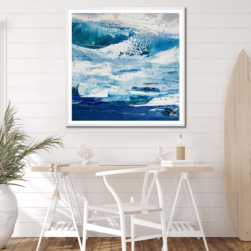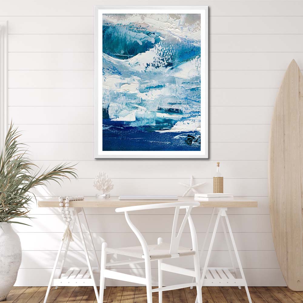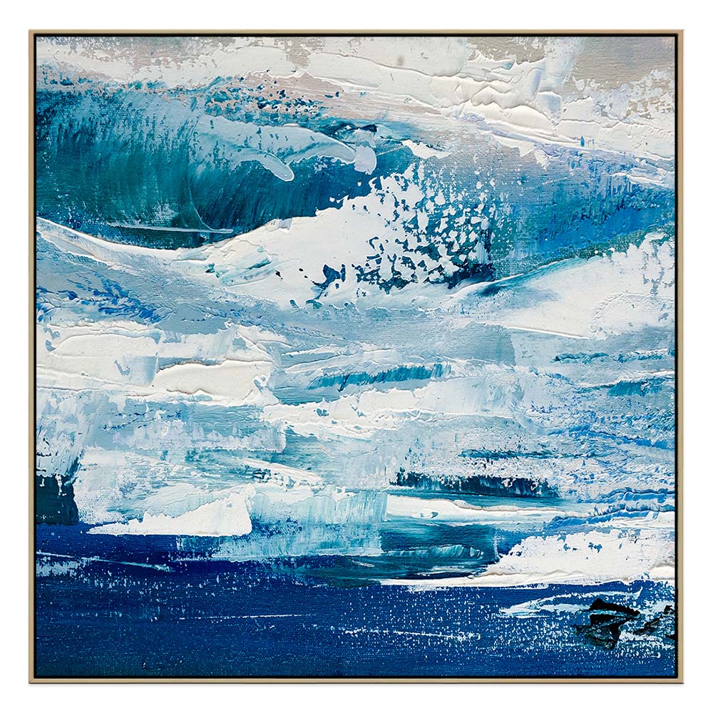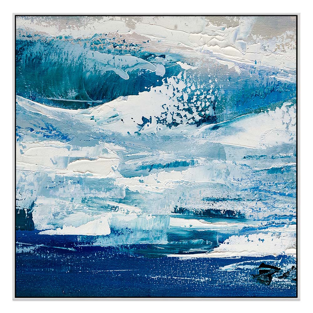 This coastal-inspired abstract artwork blends blue and white tones with soft, natural textures, evoking the calm rhythm of the ocean. Elegant and timeless, it brings a refined coastal sophistication to any modern interior.